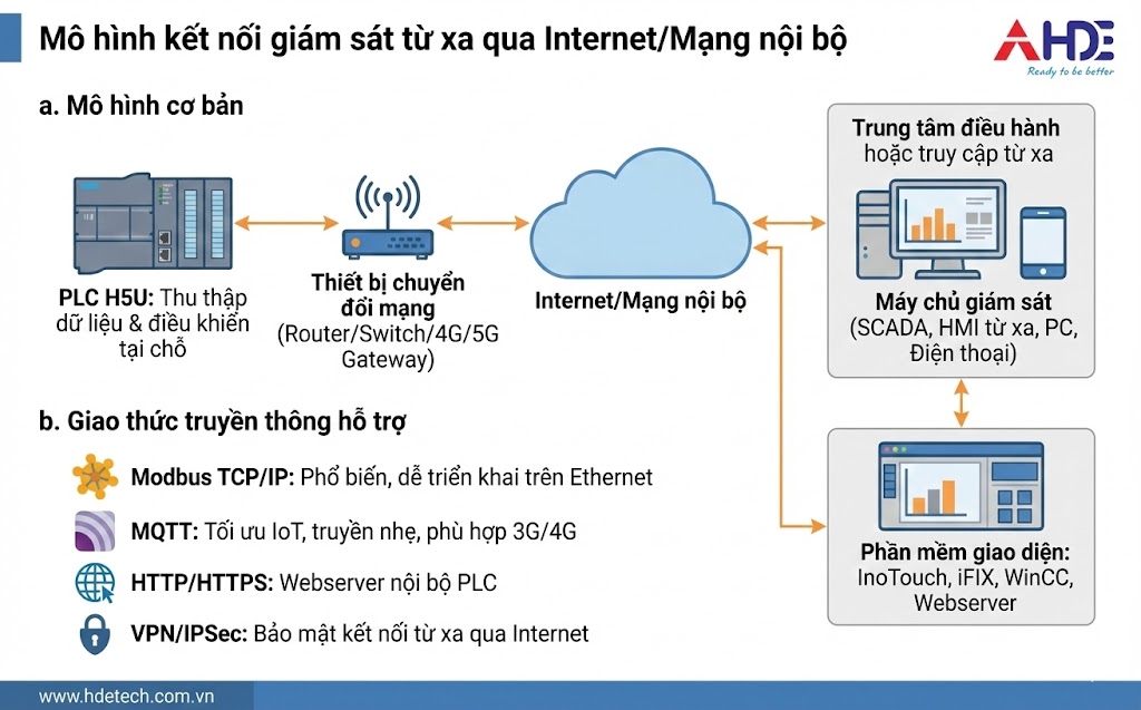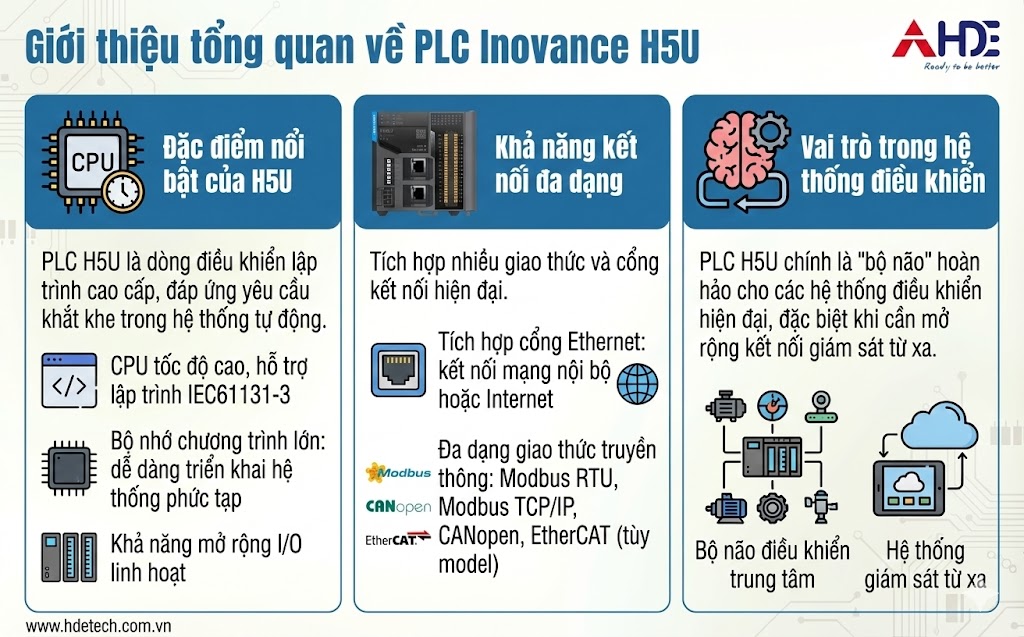 Trong kỷ nguyên của chuyển đổi số và tự động hóa công nghiệp, nhu cầu giám sát, điều khiển hệ thống từ xa ngày càng trở nên thiết yếu. PLC H5U của Inovance – dòng PLC mạnh mẽ với khả năng truyền thông đa giao thức – là lựa chọn lý tưởng để triển khai các hệ thống điều khiển giám sát từ xa một cách linh hoạt, bảo mật và tiết kiệm chi phí. Bài viết này sẽ hướng dẫn chi tiết cách kết nối PLC H5U với tủ điều khiển giám sát từ xa, đồng thời chia sẻ kinh nghiệm từ các dự án do HDE Tech thực hiện trên nền tảng thiết bị Inovance.