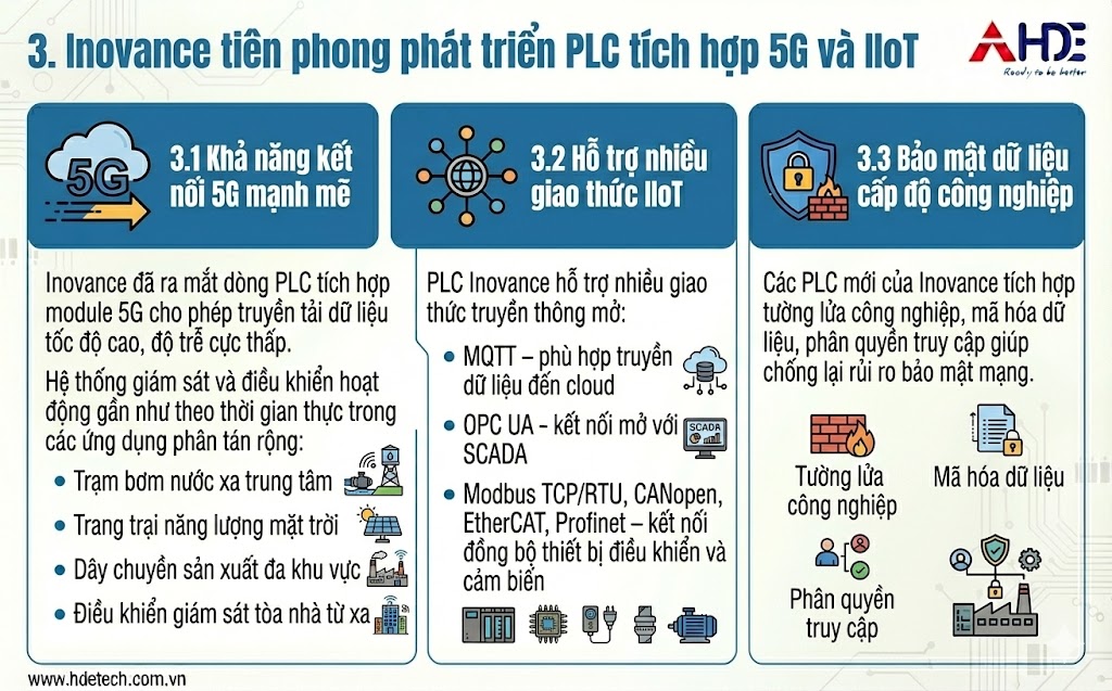 Inovance đã ra mắt dòng PLC tích hợp module 5G cho phép truyền tải dữ liệu tốc độ cao, độ trễ cực thấp. Điều này giúp hệ thống giám sát và điều khiển hoạt động gần như theo thời gian thực, kể cả trong các ứng dụng phân tán rộng như: